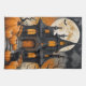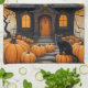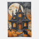 Eine spukhafte Silhouette eines Spuk Hauses steht gegen einen pulsierenden Vollmond. Seltsam, die Gnarrbäume greifen wie Skelettfinger in den Himmel, während glühende Jack-o'-Laternen den Hof betreten. Eine schwarze Katze, ein familiärer Geist der Saison, sitzt im Vordergrund, ihre Augen reflektieren das unheimliche Licht. Das Kunstwerk wird von einer bemerkenswerten Farbpalette in Schwarz und Orange dominiert, die sich perfekt für eine klassische Halloween-Stimmung eignet.