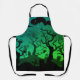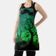 Schwarz und Neon grün Spuk Friedhof Halloween Schürze. Diese Schürze zeigt einen Spuk Friedhof in schwarz und neongrün mit Grabsteinen, spoky Bäumen, Hexe, Eule und Fledermäusen.