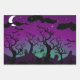 Spuk Halloween-Papier aus dem Friedhof. Ein Spuk Friedhof mit Grabsteinen, sprichwörtlichen Bäumen, einer Hexe, einer Eule und Fledermäusen sind die Elemente dieses coolen Halloween-Designs. Das erste Blatt ist lila und aqua, das zweite in aqua und gelb und das dritte in rot und olivgrün.