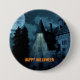 Halloween thematisches Design zeigt künstlerisch-digitale Malerei von beängstigenden Spuk gotischen Herrenhaus auf dem Hügel mit dunkelblau und grauem Himmel. Benutzerdefiniertes orangefarbenes Texteüberlagerungs-Layout im Grungestil