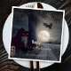 Spuk Halloween-Papierservietten mit einer nächtlichen Landschaft mit schwarzer Katze, Spinne und Fledermaus bei Vollmond. Im Baum sind subtile Party-Lichter.
