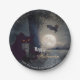 Spuk Halloween-Teller mit einer nächtlichen Landschaft mit schwarzer Katze, Spinne und Fledermaus bei Vollmond. Im Baum sind subtile Party-Lichter.