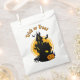 Vergnügen Halloween-Trick oder Leckerbissen mit einem Spuk Haus mit einem Glockenturm, in dem die Fledermäuse umherfliegen. Eine beängstigende schwarze Katze und eine geschnitzte Jack-o-Laterne im Vorgarten und ein Vollmond im Hintergrund. Oben in fett orangefarbenen Schriftzeichen angekommen, ist Trick oder Treat.