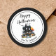 Geben Sie den Gästen zu einem alljährlichen Halloween-Kostüm-Party oder zu jeder Veranstaltung mit diesem lustigen und einfachen Aufkleber ein paar schöne Gastgeschenke. Ein einfaches Schwarz-Weiß-Gesamtbild, das eine Mischung aus einfacher Schrift und Schrift-Typografie hat. Spuk, schwarz-weißes Haus mit orangefarbenen Akzenten aus einem Baum, Kürbissen und Kürbislaternen. Ein paar Geist- und Fledermausakzente, um den Spaß zu beenden. Spaß Niedliche Spooky Spuk House Ghost Bats Orange Black Happy Halloween Party Klassischer Round Sticker