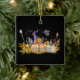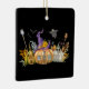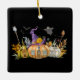 Ornament mit einem niedlichen Bild eines Spuk Kürbishauses mit einer großen Hexe, die oben ist, und Geistern und Fledermäusen, die herumfliegen.