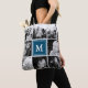 Square Foto Collage Navy Mit Monogramm Custom Tote Bag. Personalisieren Sie dieses individuelle Design mit bis zu 8 Fotos und Ihrem eigenen Monogramm-Initial- oder benutzerdefinierten Text.