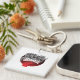 Square keychain with a graphic of smoke and a red heart-shaped base, featuring bold text. Shown on its own and beside flowers, notebook, and phone.