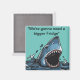 Square Kühlschrankmagnet mit Great white shark design vor einem blauen Hintergrund mit dem Text "bräuchte einen größeren Kühlschrank"