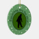 Diese lustige Menschenweihnachtsbaumverzierung sagt Squatching durch den Schnee. Sie ist auf einem grünen Hintergrund, der wie Schnee aussieht.