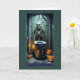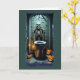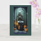 Cette carte d'Halloween originale et humoristique présente un squelette éffrayant assis sur une toilette dans une salle de bain sombre. La scène est décorée d'éléments d'Halloween classiques, dont des lanternes jack-o' brillantes, des bougies scintillantes et des chauves-souris volant contre le mur carrelé. La posture décontractée et presque nonchalante du squelette ajoute une touche comique au cadre éffrayant, faisant de cette carte une carte idéale pour ceux qui aiment rire pendant la saison d'Halloween.