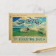 Vintage St. Augustiner Postkarten mit einem Surfer, der in einem türkisblauen Wasser mit puffblauen Wolken über einer Welle reitet. Dieses coole Retro-Design aus der Mitte des Jahrhunderts ist der perfekte Weg, um Gäste in Ihrer St. Augustine Florida Hochzeit in Urlaubsort zu treffen.
