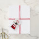 Auf der Vorderseite dieses Holiday Geschenketiketts ist ein Bild eines niedlichen Heiligen Bernard Welpen in einem rot-weißen Weihnachtsgeschenksack. Hinter dem Hund befindet sich eine Reihe farbenfroher Urlaubslichter. Im Text oben steht "Frohe Weihnachten". Die Rückseite des Tags wiederholt das Bild der Holiday-Lichter, mit Textfeldern in rot, die Sie anpassen können.
