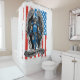 St- MichaelDuschvorhang. St Michael ist der Schutzpatron der Gesetzesvollstreckung und hier hält er einen Polizei-Taktstock in jeder Hand. Die Handschellen hängen von seinem Gurt mit einem Flaggehintergrund. Religiöser Polizeibeamtebadezimmer-Duschvorhang. Polizei über seinem Kasten und großen Engel wings. Verteidigen Sie uns in der Kampffahne. Duschvorhang für Polizeibeamten.