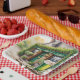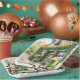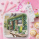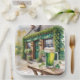 A watercolor painting of a charming Irish pub decorated for St. Patrick's Day, with emerald green shamrocks and festive banners adorning the rustic wooden exterior. The pub features a classic dark green door with brass fixtures and window boxes overflowing with vibrant green ivy and white flowers. On a small outdoor table sits a frothy green beer with a perfect foam head, surrounded by delicate four-leaf clovers scattered across the weathered wood surface. The entire scene is rendered in soft, flowing watercolor washes with gentle bleeding edges, creating a dreamy atmosphere filled with warm golden sunlight filtering through the Irish countryside.