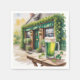 A watercolor painting of a charming Irish pub decorated for St. Patrick's Day, with emerald green shamrocks and festive banners adorning the rustic wooden exterior. The pub features a classic dark green door with brass fixtures and window boxes overflowing with vibrant green ivy and white flowers. On a small outdoor table sits a frothy green beer with a perfect foam head, surrounded by delicate four-leaf clovers scattered across the weathered wood surface. The entire scene is rendered in soft, flowing watercolor washes with gentle bleeding edges, creating a dreamy atmosphere filled with warm golden sunlight filtering through the Irish countryside.
