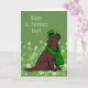 St Patrick Tagesstilvolle Schokoladen-Labrador-Gruß-Karte. Einzigartiger und lustiger Labrador-Retriever-Cartoon-Entwurf geschaffen von Naomi Ochiai von Japan. Niedliche und stilvolle Schokolade Labrador, das glücklichen St Patrick Tagestragenden Kobold-irischen grünen Hut und grünen Schal feiert. Nette Labrador-Geschenke für irische Hundeliebhaber, die Schokolade Labradors! besitzen! Glückliches vierblättriges Kleeblatt Muster im Hintergrund.