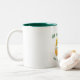 Die St. Patrick's Day Tasse bietet ein festliches Kleeblatt-Grün und Goldthema. Auf dem Bild befinden sich zwei Bierhütten auf beiden Seiten eines Kobold, der mit vierblättrigen Kleeblatten gefüllt ist. Ein goldenes Hufeisen umrahmt das Bild.