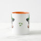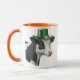 St. Patrick's Day Tasse mit einem Aquarellbild einer Schwarz-Weiß-Kuh in einem grünen Hut mit Goldband und weißer Blume und Kleeblättern. Drei kleine grüne Kleeblatt vor der Tasse. Zusätzliche Größen und Felgen- und Grifffarben sind verfügbar.