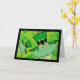 Carte de voeux St. Patrick's Day avec des grenouilles drôles portant des casquettes leprechaun avec boucle d'or. Un Arrière - plan pleut des shamrocks à propos d'un arrière - plan de sunburst vert.