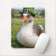 Eine Gans mit einer kleinen St. Patrick's Day-Mütze mit einem Vierblattklee und einer Brille steht auf einem grasbewachsenen Feld unter einem klaren Himmel