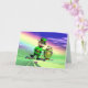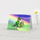 Grußkarte mit meinem Original-Bild eines Leprechaun-Charakters, der sich ein paar Münzen aus seinem Topf Gold unter einem Regenbogen holt.