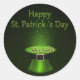 Eine magische St. Patrick's Day Illustration mit einem grünen Hut voll mit goldenen Kleeblatt-Münzen, glitzernd auf schwarzem Hintergrund.