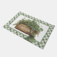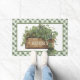 This whimsical St Patrick's Day door mat features a box of clover with the word "lucky" on the front. There is a coordinating green and white gingham border around the edge.