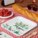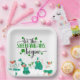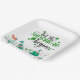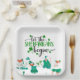 Lass, die Shenanigans beginnen Sprichwort in Skripttypografie, St. Patrick's Day Party Papier Teller mit tanzenden Party Goers in grün mit Kleeblättern.