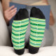 Celebrate St. Patrick's Day with striped socks. This design features various shades of green on a white background. There's a white badge, on the outside calf, of the each sock. The text reads, 'HAPPY ST. PATRICKS DAY” and has a neon green shamrock, in the center.