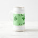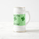 Niedliche Kleeblätter auf hellgrünem Hintergrund, auf einem Bierstein für St. Patrick's Day Geburtstage. Der Text lautet: "St. Patrick's day is my year!" Der Text kann leicht geändert werden.