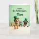 This card shows four pets peeking up from behind a bright white ledge, set against a pale green background that feels calm and festive 💚. A golden retriever in the middle wears a green top hat with a gold buckle and smiles with its mouth open, as if leaning in for attention like a close friend. To one side, a pug in a matching hat looks up with a quieter, steady gaze that reads like loyal affection. An orange tabby kitten and a grey tabby kitten press their paws to the ledge, their wide eyes and soft fur giving the scene a gentle, cozy closeness. The grey tabby adds a green bow tie, and the retriever’s green collar holds a small shamrock charm ☘️. Across the top, dark green uppercase text reads “HAPPY ST. PATRICK’S DAY, Mom,” centered above the animals and standing out clearly against the light background. The green hats and accents echo the backdrop while the white ledge creates a crisp horizontal line beneath their faces. Soft lighting highlights the pets’ eyes, the gold buckles on the hats, and the little shamrock charm near the center.