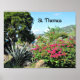 Herrliche Aussicht auf tropische Blume und Pflanze auf der US Jungfrau Insel St. Thomas. Ein flüchtige Blick am blauen Wasser und Berg mit Häusern sind im Hintergrund. Worte: "St. Thomas" ist auf Szene geschrieben.