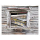 Die Überreste eines alten Schildes im Fenster einer verfallenen Scheune.