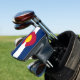 Die farbenfrohe rote, weiße, blaue und goldene Farbtafel des Colorado State Flag mit dem gelben Sonnenbild, umgeben vom roten Blockbuchstaben C auf einem blau-weiß gestreiften Hintergrund.