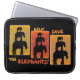 Dieser Laptop-Ärmel verfügt über kompakte Karawanen von Elefanten 3 hoch gestapelt vor Hintergrund von orangen, vergoldeten Blätter auf schwarz gestapelt. Nachricht auf der Vorderseite: "Hilfe! Rett The Elephants" ist es, die Bemühungen der World Wildlife Foundation zu unterstützen. (IconDoIt hat 100% Gewinne aus dem Verkauf dieser Tasche an WWF zugesagt)