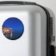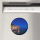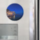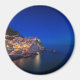 Rund Foto Magnet mit der kleinen Stadt Manarola, 1 der fünf berühmten Cinque Terre Hügelstädte, gebaut auf einer Klippe mit Blick auf das Mittelmeer, mit den Lichtern während der Blauen Stunde am Anfang der Nacht in Ligurien, Italien.