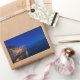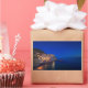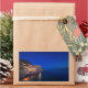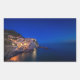 Rechteckiger Aufkleber mit dem kleinen Städtchen Manarola, 1 der fünf berühmten Cinque Terre Hügeldörfer, errichtet auf einer Klippe mit Blick auf das Mittelmeer, mit den Lichtern während der Blauen Stunde am Anfang der Nacht in Ligurien, Italien.