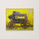 Ein dunkler Holzstagecoach sitzt unter einer schleichenden Sonnenlandschaft der Wüste auf einem trostlosen Pfad zwischen Kakteen, während Vögel überfliegen. Altes West Bild schwarzer Trainer auf gelbem Hintergrund mit einem Stacheldrahtsrand um den Außenrand des Bildes, indem eine grobe Persönlichkeit und eine scharfe Kante dessen hinzugefügt werden, was einer der Verkehrsträger des Alten Westens war.