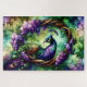An enchanting peacock rests within a circular wreath of blooming florals and woven branches, rendered in a luminous stained glass style. Jewel-toned blues, greens, violets, and soft golds flow through layered feathers, creating a sense of graceful movement and quiet wonder. The mosaic-inspired background adds depth and softness, blending organic shapes and gentle color transitions that feel both folk-inspired and whimsical. Delicate blossoms frame the composition, lending a romantic cottagecore mood with subtle boho charm. The overall aesthetic is serene yet vibrant, balancing intricate detail with a soothing, storybook atmosphere that celebrates nature, beauty, and quiet elegance. AI generated artwork.