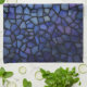 This vibrant kitchen towel features a close-up of an abstract mosaic pattern in shades of blue and purple, featuring irregular black outlines creating a stained glass effect with textured details. Finished in a mixed media art print.