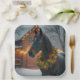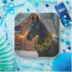 Ein schwarzes Pferd steht in einer schneebedeckten Landschaft mit einem festlichen Lichtschacht um den Hals.