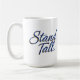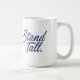Ein kühnes und bestärkendes Grafikdesign mit der Phrase "Stand Tall" in einem königsblauen Skript. Der Text ist elegant mit einem weißen Hintergrund Set, was eine luxuriöse und inspirierend Atmosphäre schafft. Die Gesamtkomposition ist sauber und modern, wobei der Schwerpunkt auf der Typografie und deren Wirkung liegt. Das Design vermittelt eine Botschaft der Stärke, Widerstandskraft und Entschlossenheit.