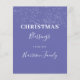 Dieses abstrakte "Star of Wonder" Gemälde besteht aus einer hellen weißen Sternexplosion auf einem blauen und lila strukturierten Sternenhintergrund mit elektrisch blauem Blitz und Sternen. Die Rückseite der Karte ist sehr peri lila mit Schneeflocken und festlichen Grüße in weiße Schrift Typografie. Um einfach Ihren Familiennamen mit den einfach zu bedienenden Vorlagen auf der rechten Seite anzupassen, erstellen Sie eine personalisierte moderne, lebendige Weihnachtskarte. Original-Kunstwerk der Künstlerin Catherine Sweetman.
