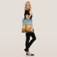 Eine personalisierte Tasche, perfekt für den Strand! Entworfen mit einem niedlichen Foto eines Seesterns, aufrecht im Sand positioniert. Unter seinen Armen befinden sich 2 kleine Muscheln, die sich bequem ausruhen. Set an einem Strand mit Wellen im Hintergrund.