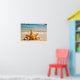 Ein Poster mit einem niedlichen Foto eines Seesterns, der aufrecht im Sand positioniert ist. Unter seinen Armen befinden sich 2 kleine Muscheln, die sich bequem ausruhen. Set an einem Strand mit Wellen im Hintergrund.