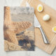 Küchenhandtuch mit landschaftlichem Foto. Ein großes Set aus Seestern direkt am Sandstrand. Ein schönes blaues Meer mit weißen Wellen im Hintergrund.