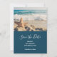 Save the Date Karte mit einem landschaftlichen Foto. Ein großes Set aus Seestern direkt am Sandstrand. Ein schönes blaues Meer mit weißen Wellen im Hintergrund.