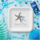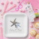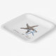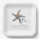 Starfish paart Hochzeitspapier-Teller. Die braunen und blauen Sternbilder stellen das Paar in diesem Design auf eckigen, weißen Tellern dar. Passen Sie zwei Textzeilen mit Namen des Paares und eine weitere Textzeile an. Die Beispielformulierung lautet: "Das Abenteuer beginnt - mit dem Datum". Verwenden Sie bei lässigen Vor-Polterabenden und Party, oder um Kuchen am Empfang zu servieren.