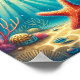 Hier ist eine skurrile und lebendige Illustration eines Seesterns, der sich auf dem sandigen Grund des Ozeans ruht, umgeben von Korallen und beleuchtet von weichem, gefiltertem Sonnenlicht, das durch das Wasser strömt.