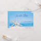 Diese Save the Date Karte zeigt eine Szene von zwei Seestern auf dem Sand, und das unberührte Meer Wasser im Hintergrund. Dieses Design ist ideal für eine Hochzeit im Sommer, eine Hochzeit am Strand, eine Hochzeit am Meer oder eine Hochzeit in Urlaubsort.